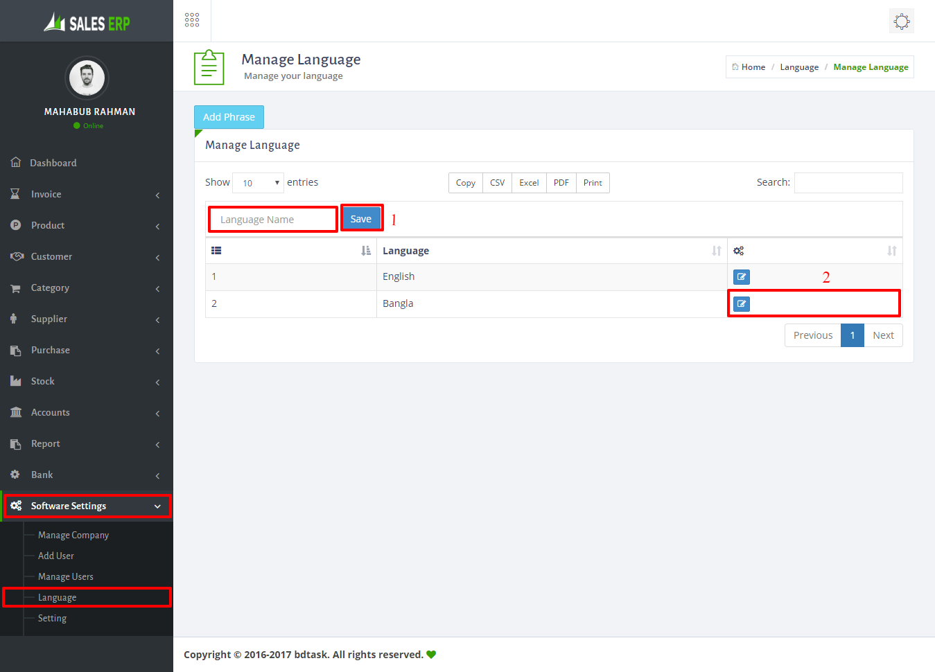 - Language setting is the important part of this software.you can add your native language in this system just go to Software Settings > Language then add your native language name and follow picture.i added my native language 'Bengali' in this system then click 2 number box of showing picture. then next phrase page will come.now add your language phrase instead English language phrase.