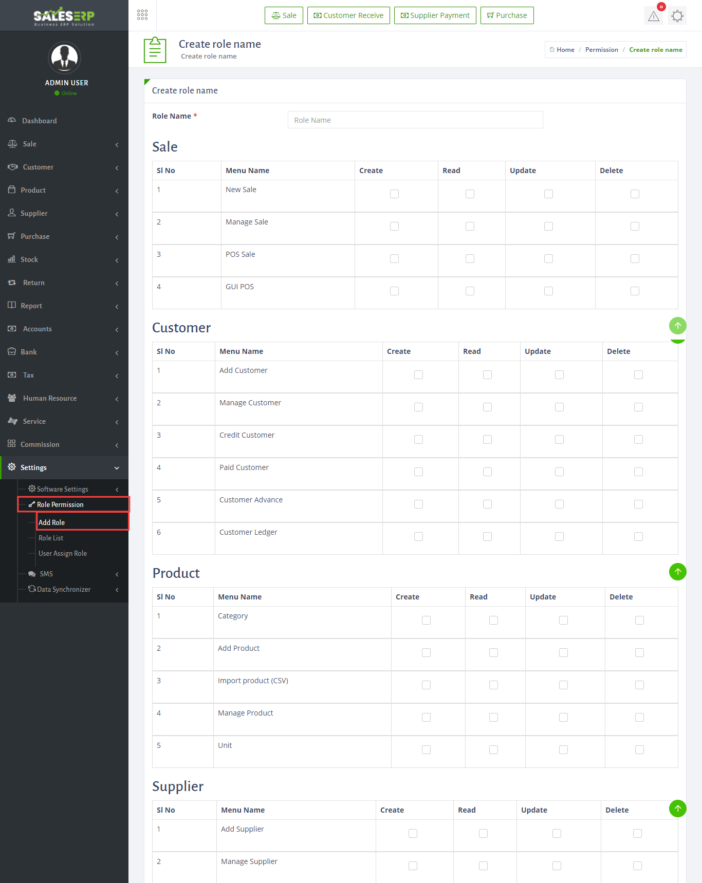 - Role Permission is a new feature of Sales ERP. You can customize the role for different user. To make a role map just go to Human Resources > Role Permission > Add Role. Now give a name of this role and select the options you want to add with this role then hit save button