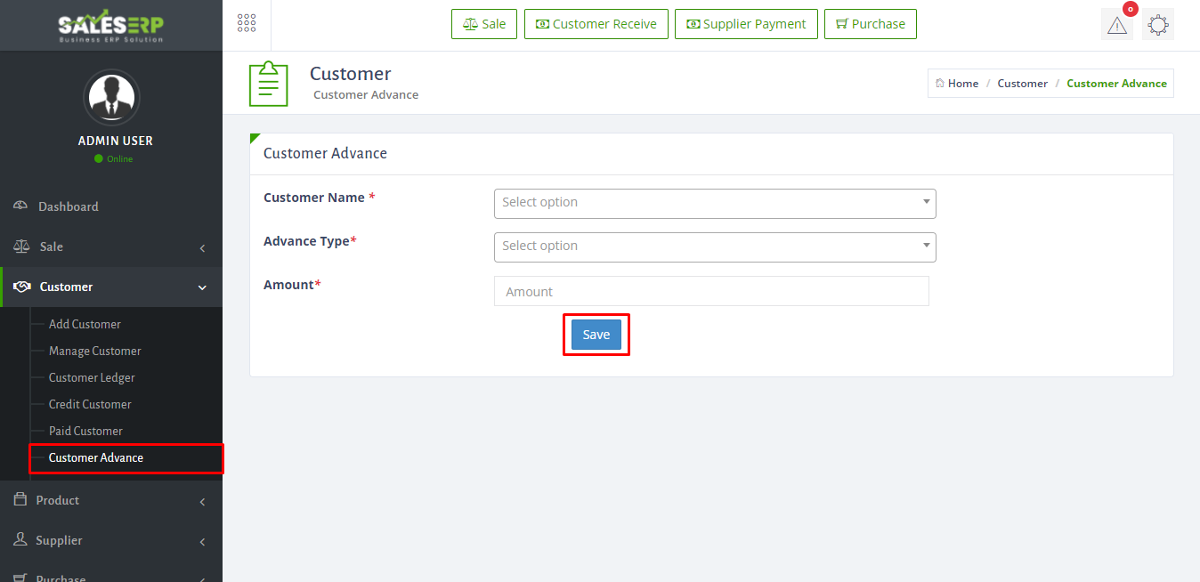 - To take advance from customer just go to Customer > Advance Customer.