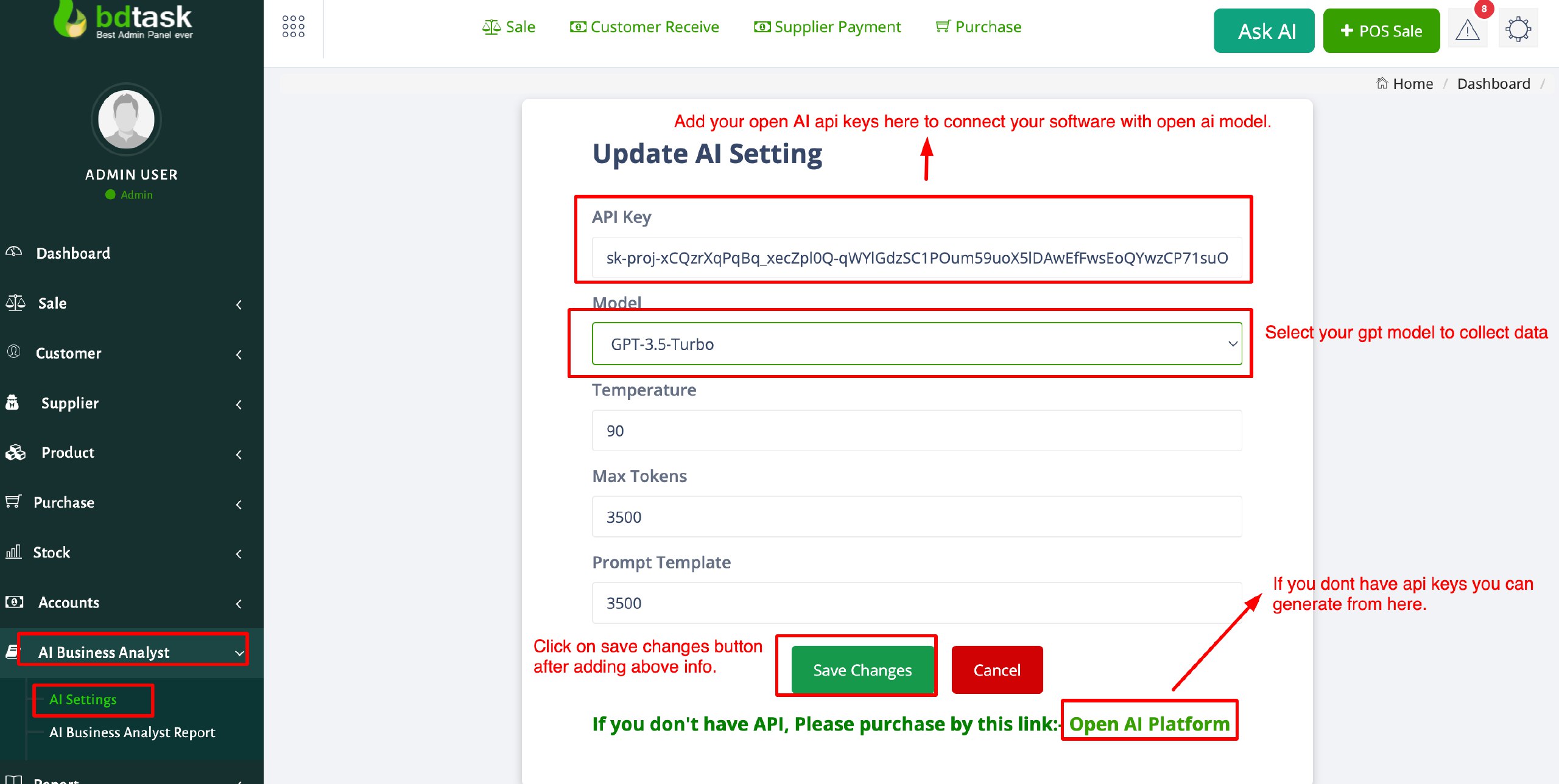 - To setup your AI model just go to setting then follow the below image instruction. At first you have to generate the OPEN AI api keys to connect your system with the open ai platform so that the ai model can analysis your data to provide accurate data.
