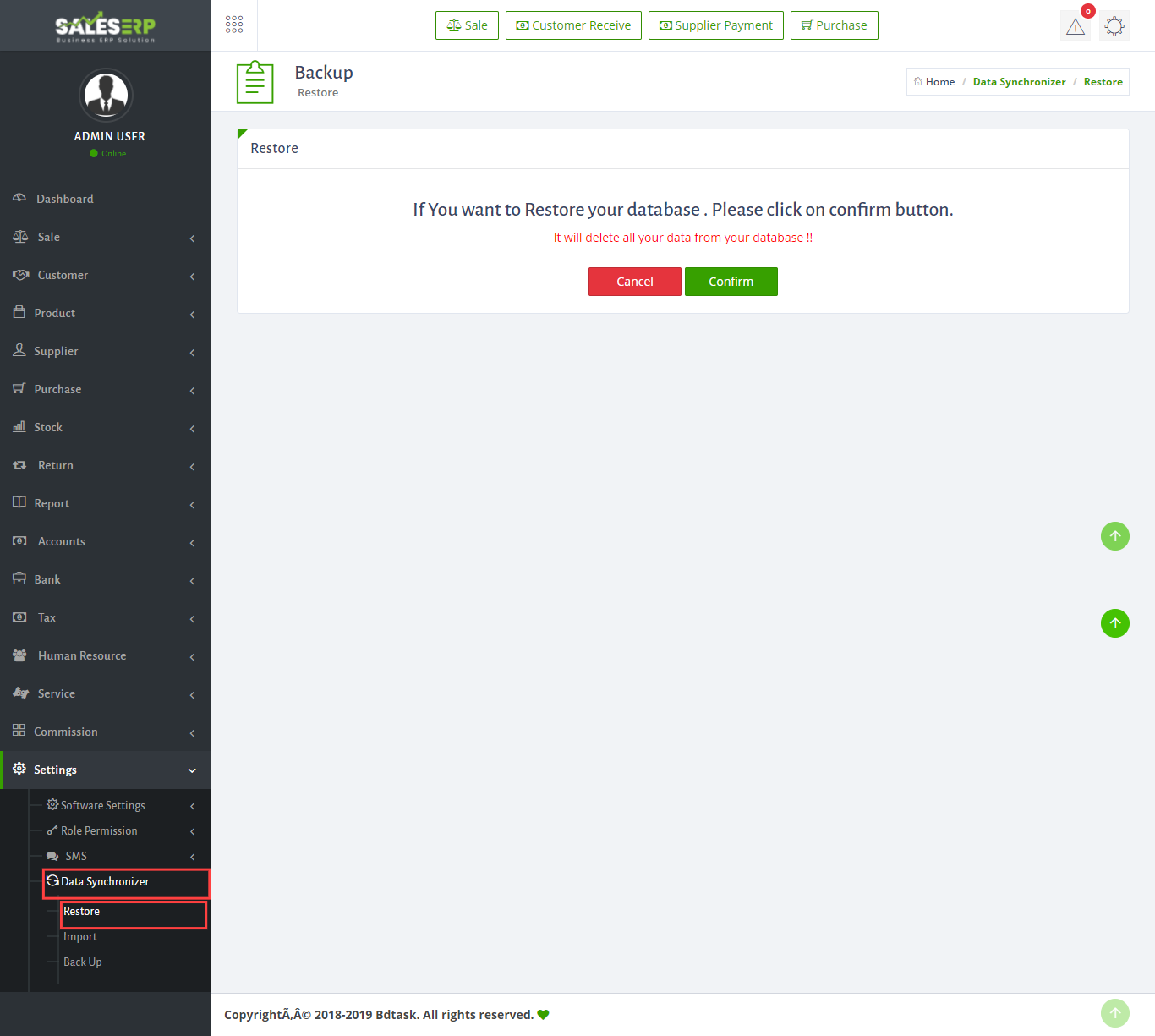 - Sale ERP has a very easy data Synchronization system. you can Restore your software to default. To do this just
