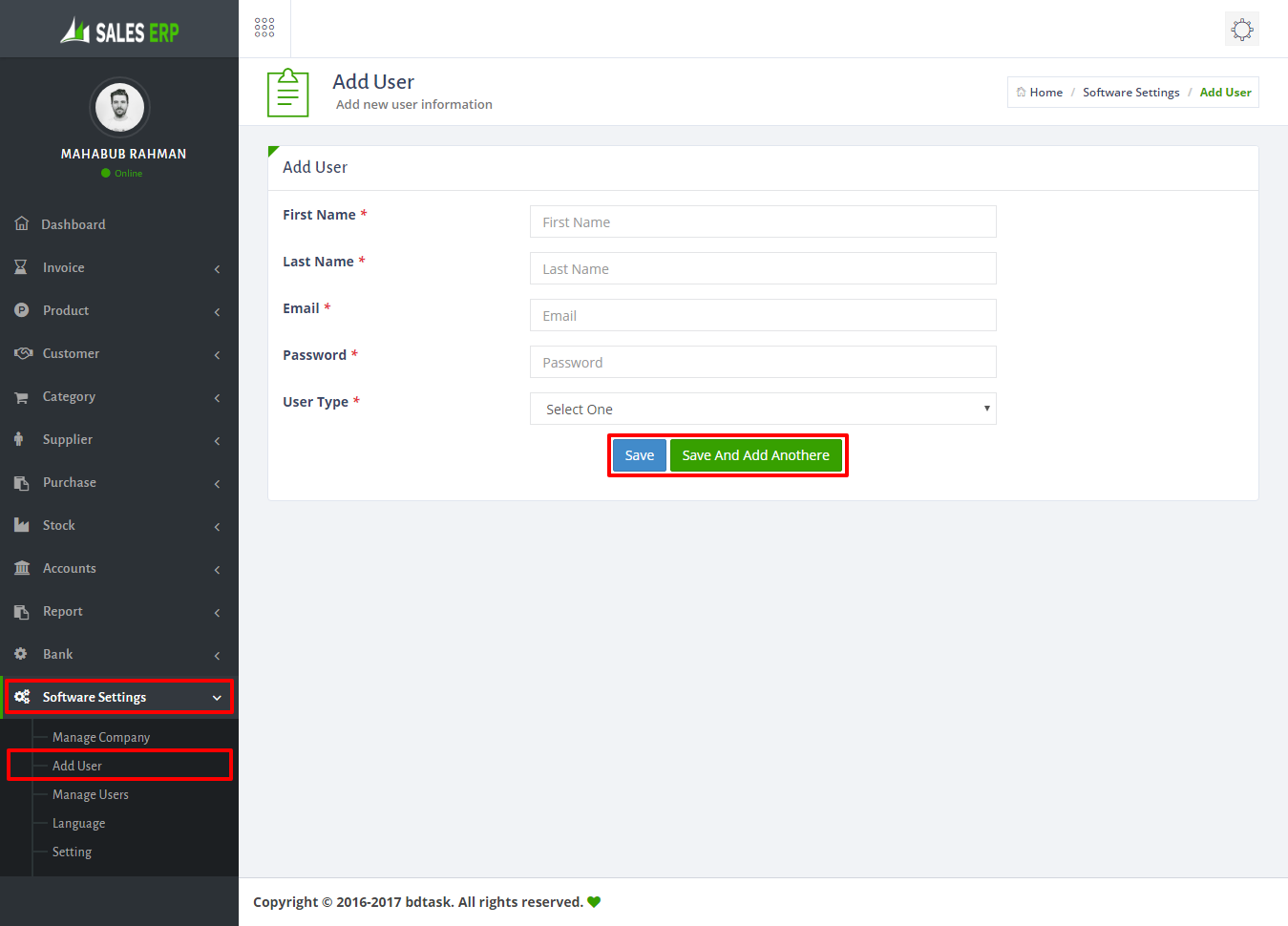 - To add new user just go to Software Settings > Add User and fill up the information then click save button.