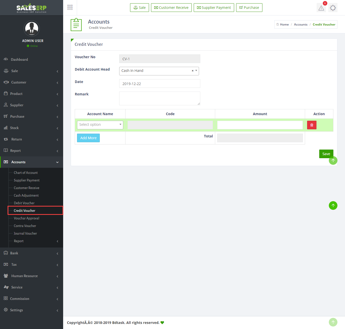 - To create a credit voucher just go to Accounts > credit voucher and fill up information then click save button.