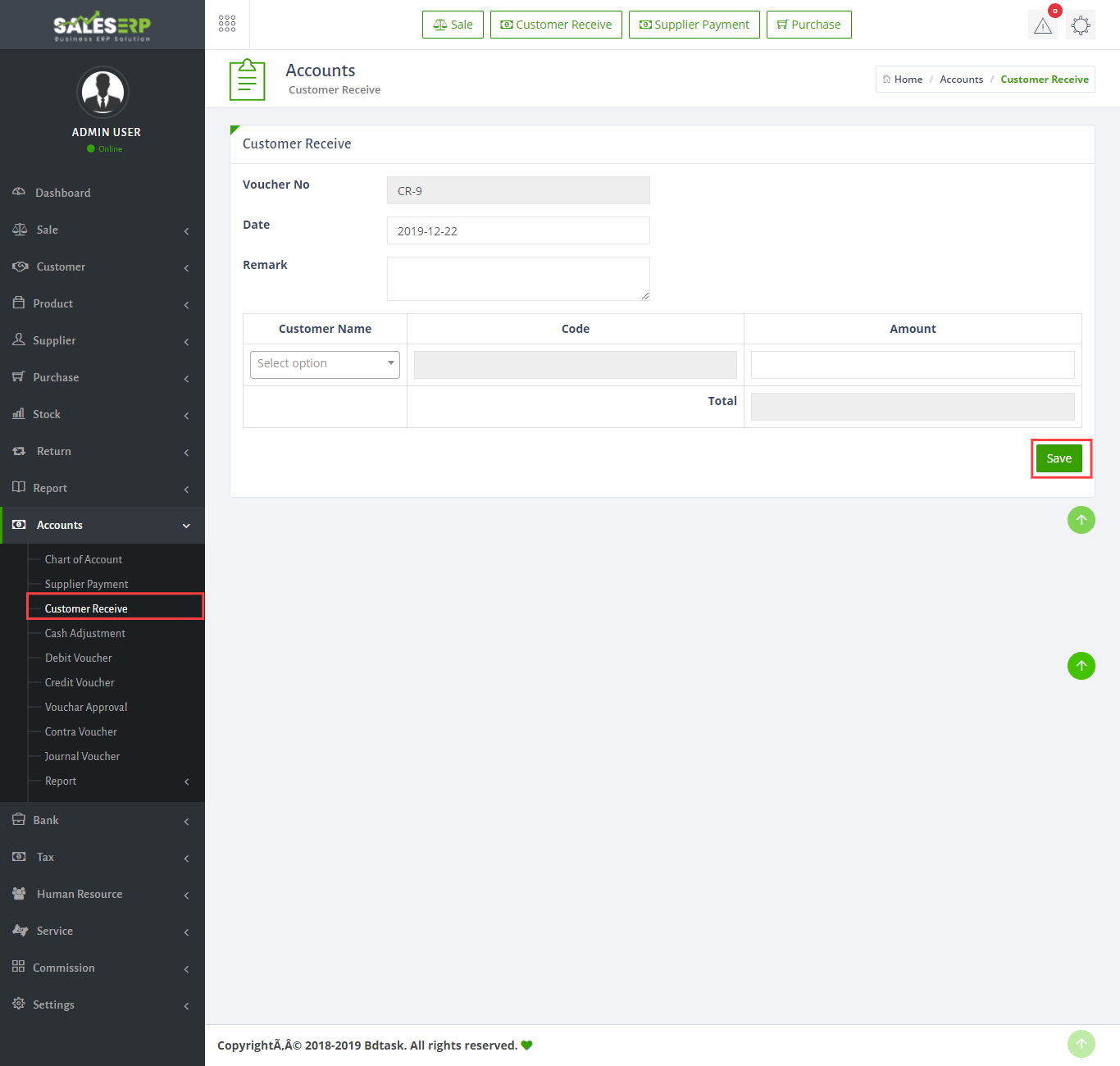 - To take payment from a Customer just go to Accounts > Custom Receive and fill up information then click save button.